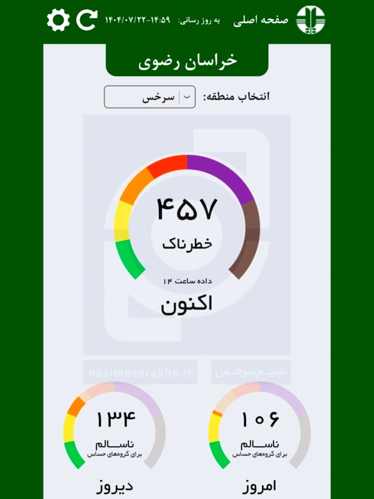 به گزارش خبرنگار نسیم سرخس، بر اساس اعلام سامانه پایش کیفی هوای کشور، شاخص هماکنون کیفیت هوای سرخس روی عدد ۴۵۷ و در وضعیت خطرناک قرار داد.