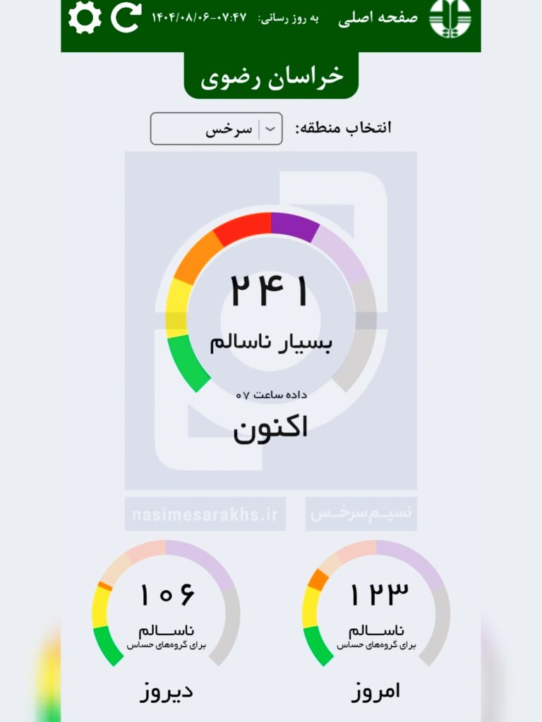 به گزارش خبرنگار نسیم سرخس، بر اساس اعلام سامانه پایش کیفی هوای کشور، شاخص کیفیت هوای سرخس روی عدد ۲۴۱ و در وضعیت بسیار ناسالم قرار داد.